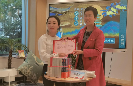 活动现场,安意如向商职院图书馆捐赠《二十四日》《故宫如梦》等10册图书,图书馆馆长陈笑缘接收了捐赠图书,并代表图书馆向安意如颁发捐赠证书。
