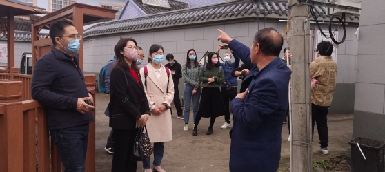 现场学的第二站我们来到了北仑梅山街道梅港村茶厂社,党支部张志岳书记在村口迎接我们,随后他带领我们边参观村子边讲解这个美丽乡村的发展史。我们沿路看到清澈碧绿的小河、干净整洁的河埠头、山顶休闲的凉亭,还有游步道周边两侧种植的樱花和梅花树,新建的村民文化活动中心,可谓一步一景,人在村中走,如在画中游。在张书记的讲述中,我们了解到梅山的过去、发展与创新,他说:“最近梅山村的建设被央视频道报导,它成为了新农村建设的榜样,我们村能有今天的样子,大家都感谢党的领导。”