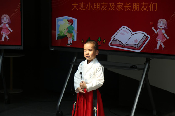 接着,身着唐装的幼儿代表董家铭用稚嫩童声,分享阅读带来的喜悦与力量:“我特别喜欢看书!翻开书本就像施了魔法,我变成了知道很多秘密的小超人!我还能把故事讲给爸爸妈妈听,和小伙伴们一起讨论,有趣极了!”他呼吁伙伴们一起阅读,让阅读陪伴大家一起成长!童真话语传递出对阅读的热爱与向往。