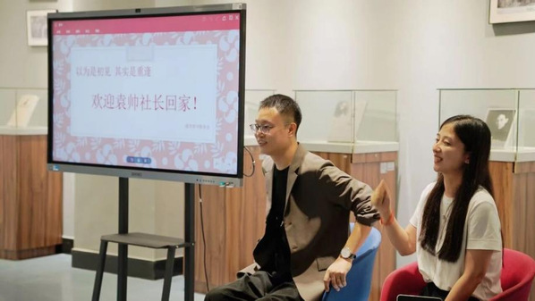 “让我们用热烈的掌声,欢迎袁社长、姜社长回家!”随着老师的话音落下,袁帅和夫人姜娜走进来,目光扫过这群年轻的脸庞,带着喜悦。瞬间,掌声如雷;瞬间,他被眼前的场景暖到:一张张写满青春,自带阳光的面孔迎接着他们,袁帅和夫人姜娜坐了下来,“原来我们当年埋下的小火苗,真的一直亮着。”他惊喜的说道。他们像聊家常一样和大家说起了往事。