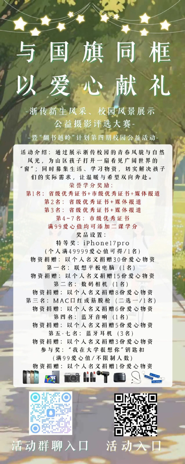 当五星红旗在晨光里舒展,当红色的光芒掠过城市街巷、田间地头、校园操场,那抹鲜艳早已超越色彩本身,成为每个中国人心底最坚实的信仰与骄傲。它见证过风雨兼程的来路,也照耀着意气风发的今朝,而此刻,我们想邀请你成为这份荣耀的“记录者”。为热烈庆祝中华人民共和国成立76周年,弘扬爱国主义精神,凝聚校园爱国力量,同时践行“奉献、友爱、互助”的公益理念,特举办本次“与国旗同框,以爱心献礼”线上活动。通过“与国旗合影”传递赤子之心,以“公益捐赠”践行社会责任,让国庆的喜庆与温暖的善意在校园中交融,引导广大同学在致敬祖国的同时,成为正能量的传播者与践行者。