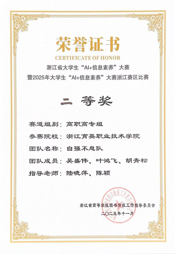 近日,2025年浙江省大学生AI+信息素养大赛获奖名单正式公布。浙江育英职业技术学院自强不息队表现优异,在高职高专赛道中荣获省级二等奖。