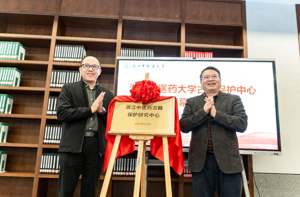 温成平、徐永盛为“浙江中医药古籍保护研究中心”揭牌。研究中心的成立,是学校优化学科布局、强化特色发展的战略举措,标志着我校在中医药古籍保护领域迈入了集收藏、保护、研究、利用、人才培养于一体的新阶段。