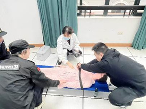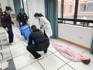 疏散过程中,图书馆电子阅览室突发“险情”——“报告!二层A202电子阅览室发现一名伤员!”。总指挥接到急报后通知医疗救护组携带担架、急救包等火速赶赴现场,小心翼翼将“伤员”转移至安全区域,并立即展开应急救护措施。