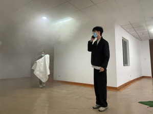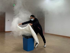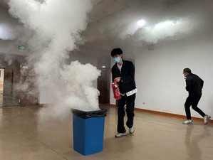 演习伊始,随着烟雾释放装置启动,浓烟迅速在馆内弥漫。“图书馆3层外馆大厅发生火情,请求支援!”图书馆杨老师发现垃圾桶着火后立即拨打安全保卫部报警电话,并与同行的万老师一起使用灭火器、灭火毯进行扑救。