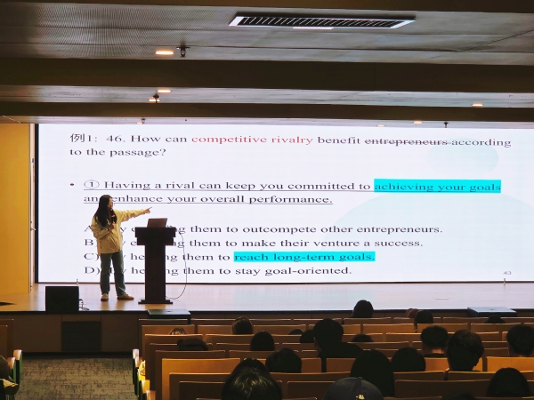 讲座伊始,闻雯老师系统解析了四六级考试的题型结构与分值比例,并详细介绍了科学的答题顺序与合理的考场时间分配策略,助力学生构建清晰的备考框架。讲解过程中,她一再强调审题精准与逻辑清晰的关键作用,结合经典例题进行剖析,帮助学生迅速理清解题思路。随后,闻雯老师分模块深入讲解了听力、写作与阅读三大的应试技巧,逐项突破备考难点;针对听力模块,闻雯老师提出以预读选项、划定关键词为核心,结合精听训练的方法,有效解决学生“抓不住重点”的普遍问题;在写作部分,闻雯老师强调审题精准与逻辑清晰的重要性,通过万能模板与典型例句的结合,帮助学生快速构建文章框架;而阅读部分,她重点讲解了题干定位法与关键词精准阅读的技巧,提升学生的答题效率与准确率。