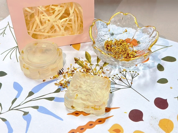在制作过程中,空气中弥漫着淡淡桂香,同学们一边搅拌一边交流心得,将秋日的气息封存于一块块晶莹的皂体中。透亮的皂基里,金桂若星屑般散落,宛若一层金箔在阳光下闪动;成品的香皂晶莹剔透、花香盈盈,既有温润的质感,又有清雅的气息,成为这一季节最动人的“桂香纪念”。