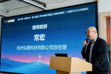 常宏总经理代表杭州弘雅科技有限公司向与会师生致以问候。他高度评价了我校《四年一本书》成果展及系列阅读活动,特别肯定了第五届“为你读一本好书”校园短视频大赛,认为作品展现了青年学子的创新活力与数字阅读素养。他期待未来读书节越办越好,持续营造浓厚校园阅读氛围。
