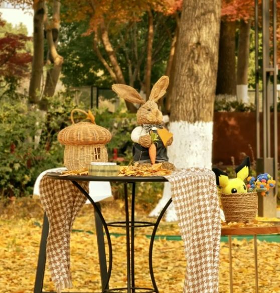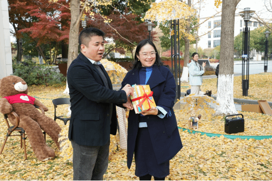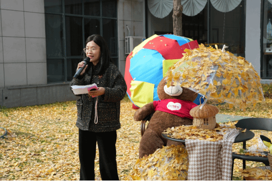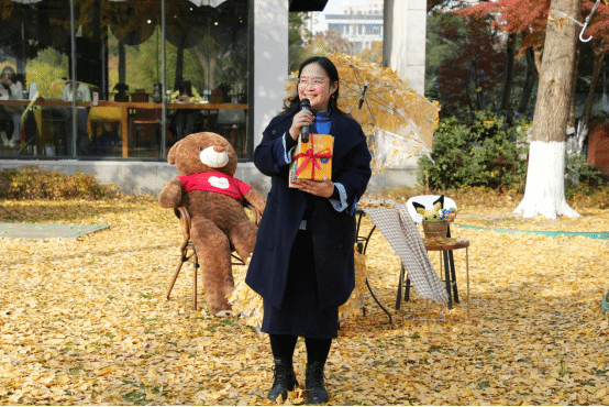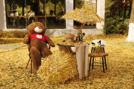 图书馆的师生将活动现场布置与银杏林的景致相映生辉,诗意又童趣。小兔子举着银杏叶伞,仿佛从童话中走出的精灵;棕色大熊慵懒的坐在椅上,憨态可掬地“倾听”着银杏叶的沙沙声,构成了与自然交响的诗会。这片融合自然巧思与童话意象的布景迅速成为全校师生拍照打卡的热门地标,每一帧画面都定格着冬日暖阳与诗意栖居的完美交融。