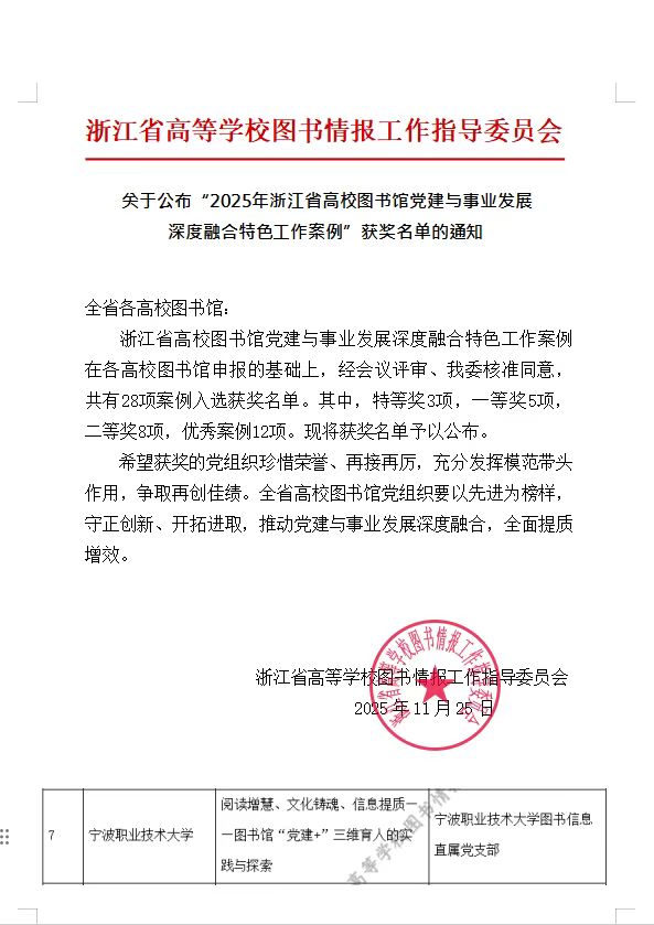 为深入贯彻落实新时代党的建设总要求和新时代党的组织路线,充分彰显高校图书馆党组织在落实《教育强国建设规划纲要(2024-2035年)》、面向“十五五”规划新起点谋篇布局的引领作用,浙江省高校图工委党建工作研究专业委员会特举办“2025年浙江省高校图书馆党建与事业发展深度融合特色工作案例”征集活动。其中,宁波职业技术大学图书馆申报的“阅读增慧、文化铸魂、信息提质——图书馆‘党建+’三维育人的实践与探索”获评优秀案例。