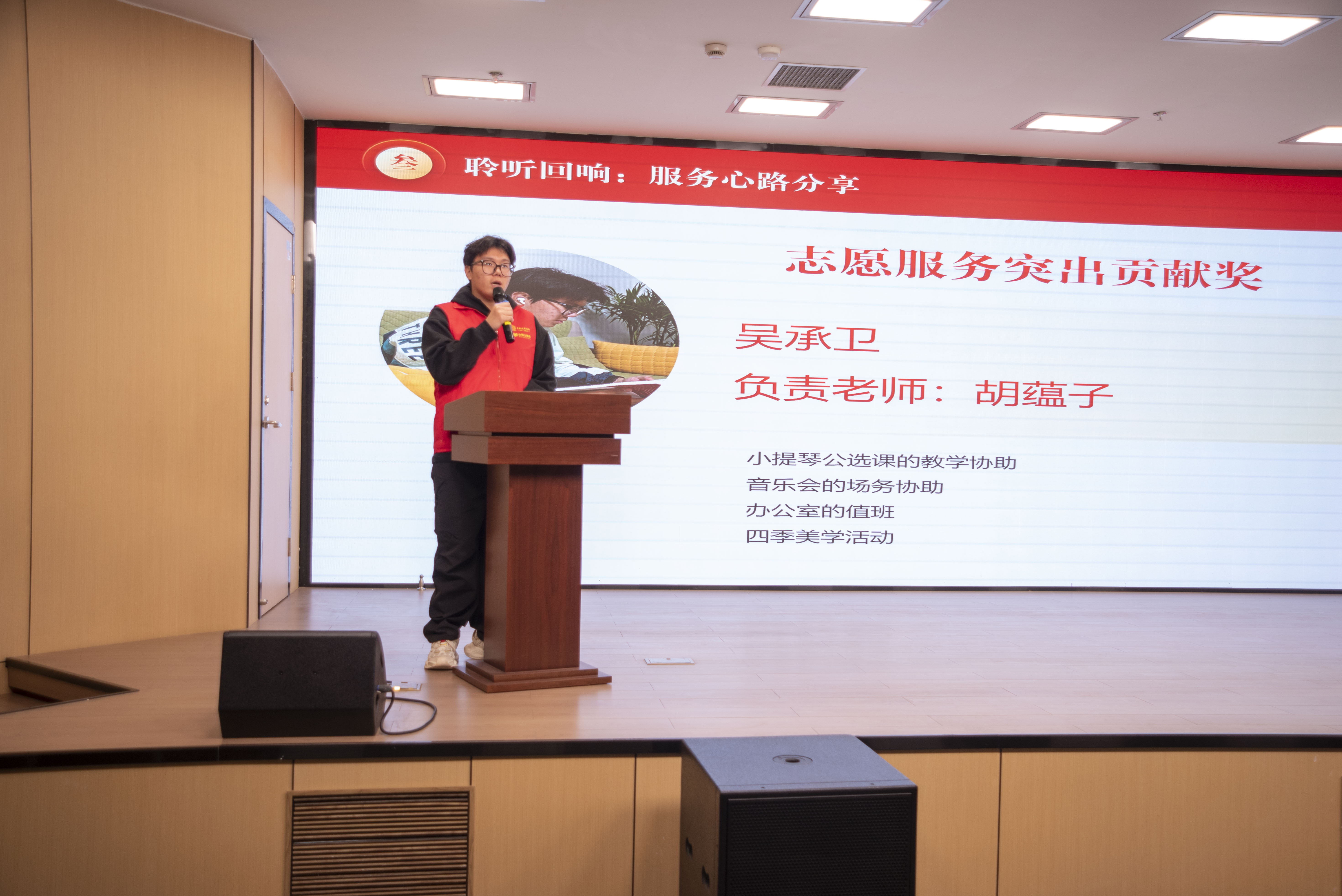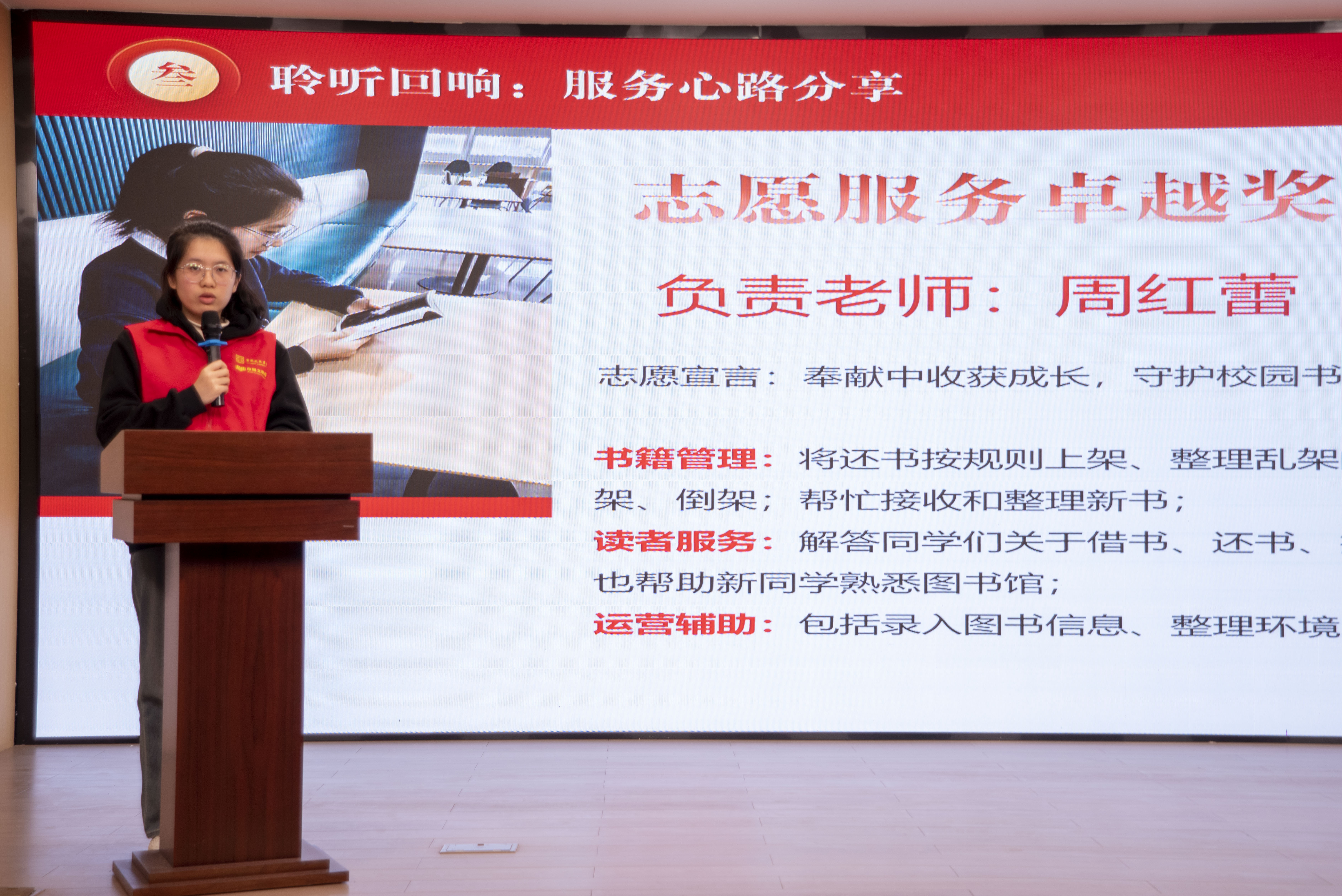 大会在一段志愿者短片中拉开帷幕,镜头生动再现了志愿者整理书架、答疑解惑、筹备活动等服务瞬间,志愿者们忙碌的身影勾勒出温暖的青春画卷,正是这些日常的坚守,铸就了不平凡的奉献。随后,志愿者大队负责老师朱婷婷以详实数据和生动图片,带领大家回顾本学期志愿服务的丰硕成果,让在场师生深切感受到了志愿服务的精神与价值。