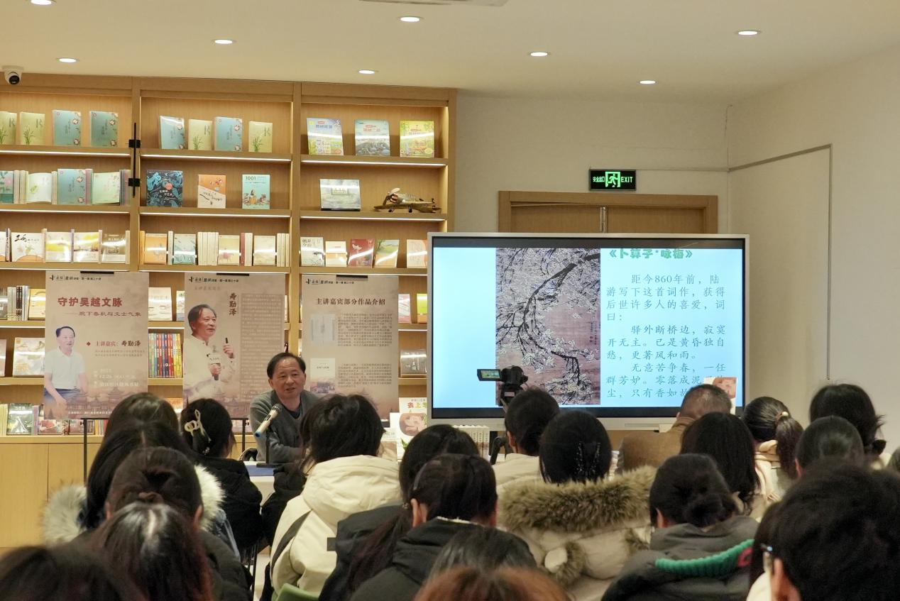 12月26日上午,浙江商业职业技术学院图书馆“碧湖讲堂”第三十讲(“碧湖讲堂·第一课”)在晓风书屋顺利开讲。本次讲座特邀西泠印社社员、中国陆游研究会理事、浙江省宋韵文化研究中心学术委员会委员寿勤泽博士以“守护吴越文脉——腕下春秋与文士气象”为主题,带领师生在笔墨流转间解读陆游的人生起伏与精神世界。图书馆馆长胡宇梁、服务拓展部主管洪素兰及40余名师生共同参与,活动由胡宇梁主持。