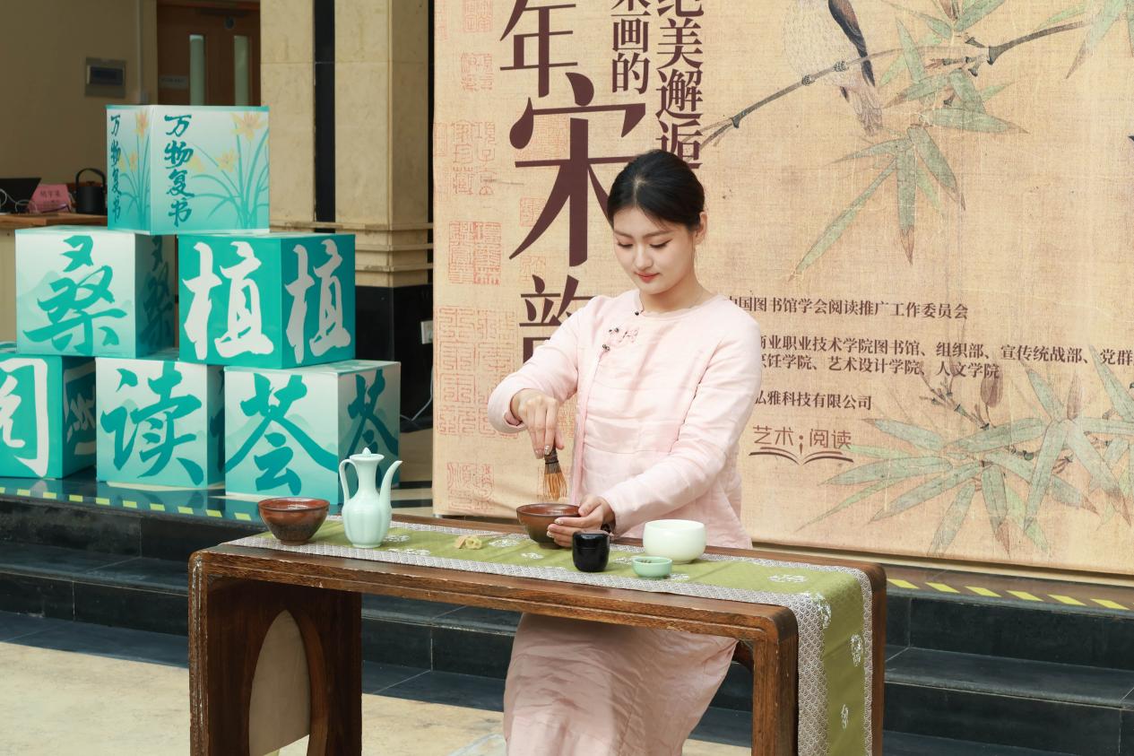旅游烹饪学院张小雷技能大师工作室张诗涵同学带来“宋代点茶”展示。娴熟的手法、雅致的流程,生动还原了宋代文人雅士的生活雅趣,让在场师生沉浸式感受宋韵文化的独特魅力。