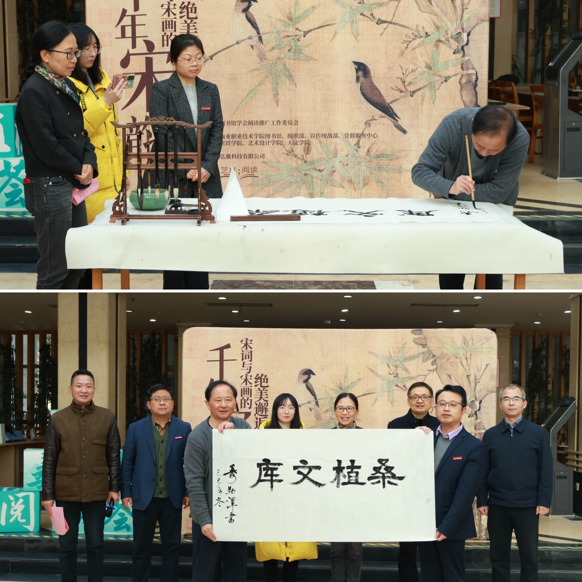 12月26日上午,“宋画与宋词的绝美邂逅”图片展暨《中国历代绘画大系》馆藏宣传推广月活动启动仪式在浙江商业职业技术学院图书馆一楼大厅隆重举行。浙江古籍出版社原社长、浙江省宋韵文化研究中心学术委员会委员、浙江大学宋学研究中心学术委员会委员寿勤泽,Artlib世界艺术鉴赏库讲师林嘉琪,学校党委副书记应金萍,党委委员、副校长嵇新浩,党委委员、组织部部长王珊,党委委员、宣传统战部部长朱小峰,旅游烹饪学院党总支书记刘晨,人文学院院长胡建钧,以及师生代表共60余人齐聚一堂,共同见证活动启幕。仪式由图书馆馆长胡宇梁主持。
