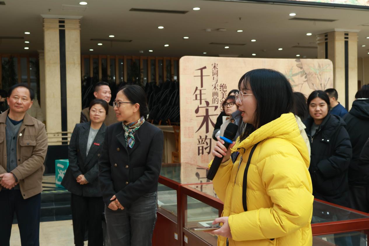 在林嘉琪老师的带领下,现场师生共同参观“宋画与宋词的绝美邂逅”图片展。林嘉琪用生动的讲解语言娓娓道来,深入解读宋画与宋词的内在关联,引领大家体验“诗画本一律”的宋人审美情趣,直观感受文学与绘画相互生发、意境交融的艺术境界。