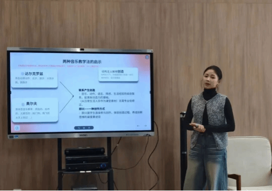 杨心悦同学分享了《在美育的天空下》一书,聚焦舞蹈教育与音乐教学法融合实践,指出当前舞蹈教育“脱脂牛奶”现象,即标准化训练虽提升技巧,但不适应新时代舞蹈教育观。她追溯国际教育舞蹈发展历程,结合美国《艺术教育国家标准》与中国素质教育经验,引出作者吕艺生的“大教育观”,以打破舞蹈教育精英化局限。她重点分享达尔克罗兹体态动律、奥尔夫原本性教育两大音乐教学法,以国家级非遗《扫蚕花地》、浙江省非遗《畲族响木舞》为例,设计“节奏探索—身体律动—集体创作”课堂模式,倡导从生活与非遗中取材,通过即兴与综合表达,在舞蹈教学中兼顾专业训练与文化本真,回归美育核心。