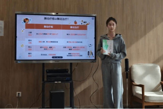张帆同学围绕《艺术疗愈实践——生命教育十堂课》中艺术疗愈核心内涵分享,指出其以心理理论为基础,通过舞动、音乐、绘画等媒介,助健康或有心理困扰人群调节情绪、认知自我。她着重区分“舞动疗愈”与“舞动治疗”,前者用于健康人群身心放松与减压,后者是针对心理问题的临床治疗手段。最后,她设计舞动疗愈环节,带大家体验,引导参与者打开身体感知力。