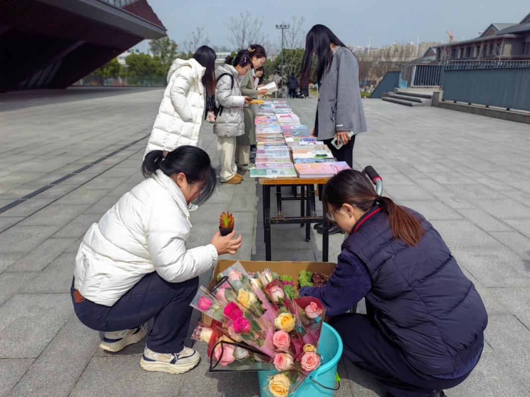 3月6日中午,“你选书 我买单”“三八节”专场活动在省身图书馆主入口处平台火热进行。图书馆联合嘉兴市新华书店精选百余种热门畅销的女性主题新书,涵盖女性成长励志、生活美学、情感疗愈等多元题材。女性读者可现场挑选心仪图书直接借阅,无需等待采购流程,实现“即选即借”。活动现场,每位办理借阅手续的女性读者均获赠事先精心准备的鲜花或盆栽小礼品,为借阅增添一份仪式感。活动深受女性读者喜爱,不少路过的师生驻足翻阅,最终挑选心仪书籍现场借走。活动结束时,现场图书几乎被借阅一空,部分读者还前往馆内继续借阅。