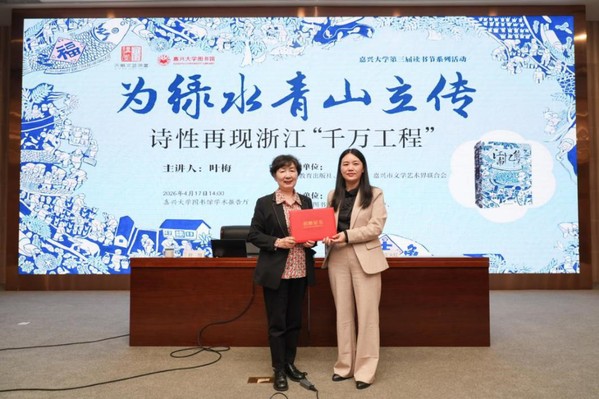 4月17日下午,著名作家叶梅莅临我校,在图书馆学术报告厅作“为绿水青山立传 诗性再现浙江‘千万工程’”的主题讲座。本次活动由浙江教育出版社、嘉兴大学、嘉兴市文学艺术界联合会主办,嘉兴大学图书馆、嘉兴市作家协会、南湖区文学艺术界联合会联合承办,校党委委员、宣传部(教师工作部)部长王火红主持,学校师生代表及嘉兴市文学爱好者共同到场聆听。
